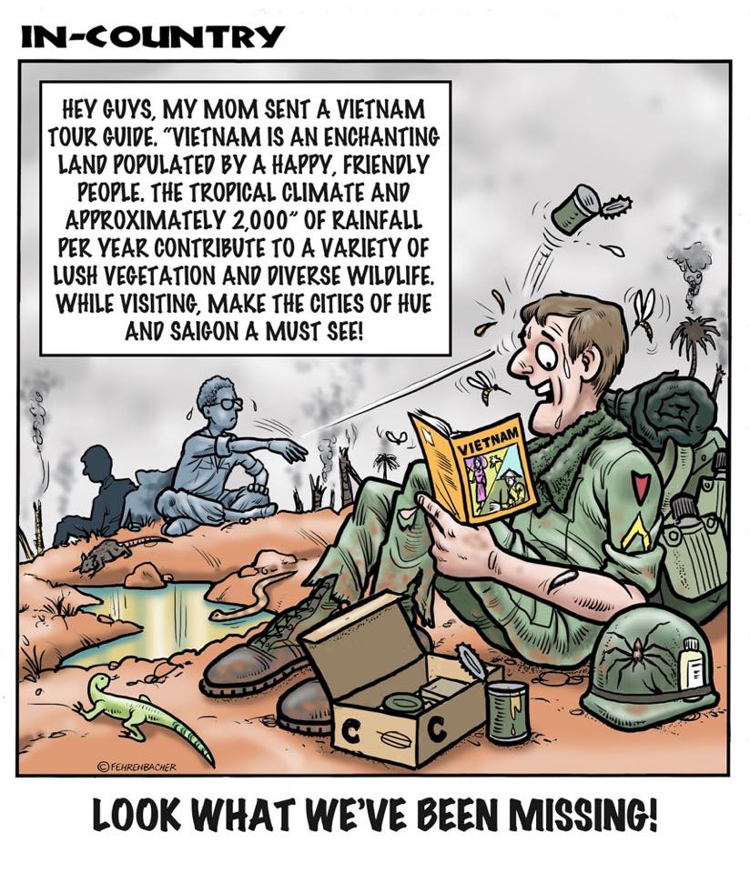 Phil enlisted in the Army in 1965 where he served for years in Vietnam.  He became a graphic designer and has worked for the state of Oregon for 26 years.  He retired in 2003 and started the Cartoon "In-Country".  The cartoons reflect his experiences during his tour of duty in South Vietnam.